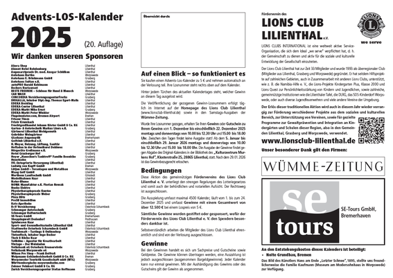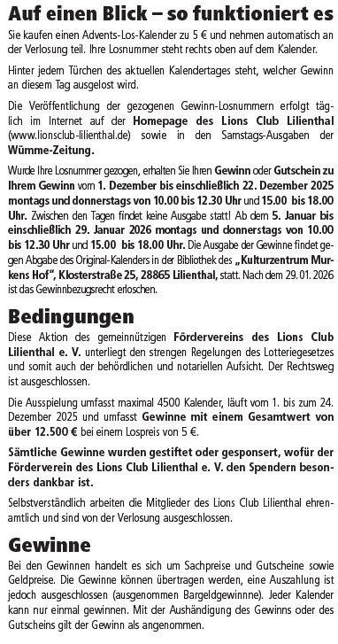So kommen Sie zur Gewinn-Ausgabestelle: Bibliothek des "Kulturzentrum Murkens Hof", Klosterstraße 25, 28865 Lilienthal.    Bitte beachten Sie die Öffnungszeiten für die Abholung Ihres Gewinns:                                                                                                         Wurde Ihre Losnummer gezogen, erhalten Sie Ihren Gewinn oder Gutschein zu Ihrem Gewinn vom 1. Dezember bis einschließlich 22. Dezember 2025, montags und donnerstags von 10.00 bis 12:30 Uhr und 15.00 bis 18.00 Uhr. Zwischen den Tagen findet keine Ausgabe statt. Ab dem 5. Januar bis einschließlich 29. Januar 2026 montags und donnerstags von 10.00 bis 12.30 Uhr und 15.00 bis 18.00 Uhr. Die Ausgabe der Gewinne findet gegen Vorlage des Original-Kalenders in der Bibliothek des "Kulturzentrums Murkens Hof", Klosterstraße 24, 28865 Lilienthal, statt. Nach dem 29.01.2025 ist das Gewinnbezugsrecht erloschen.